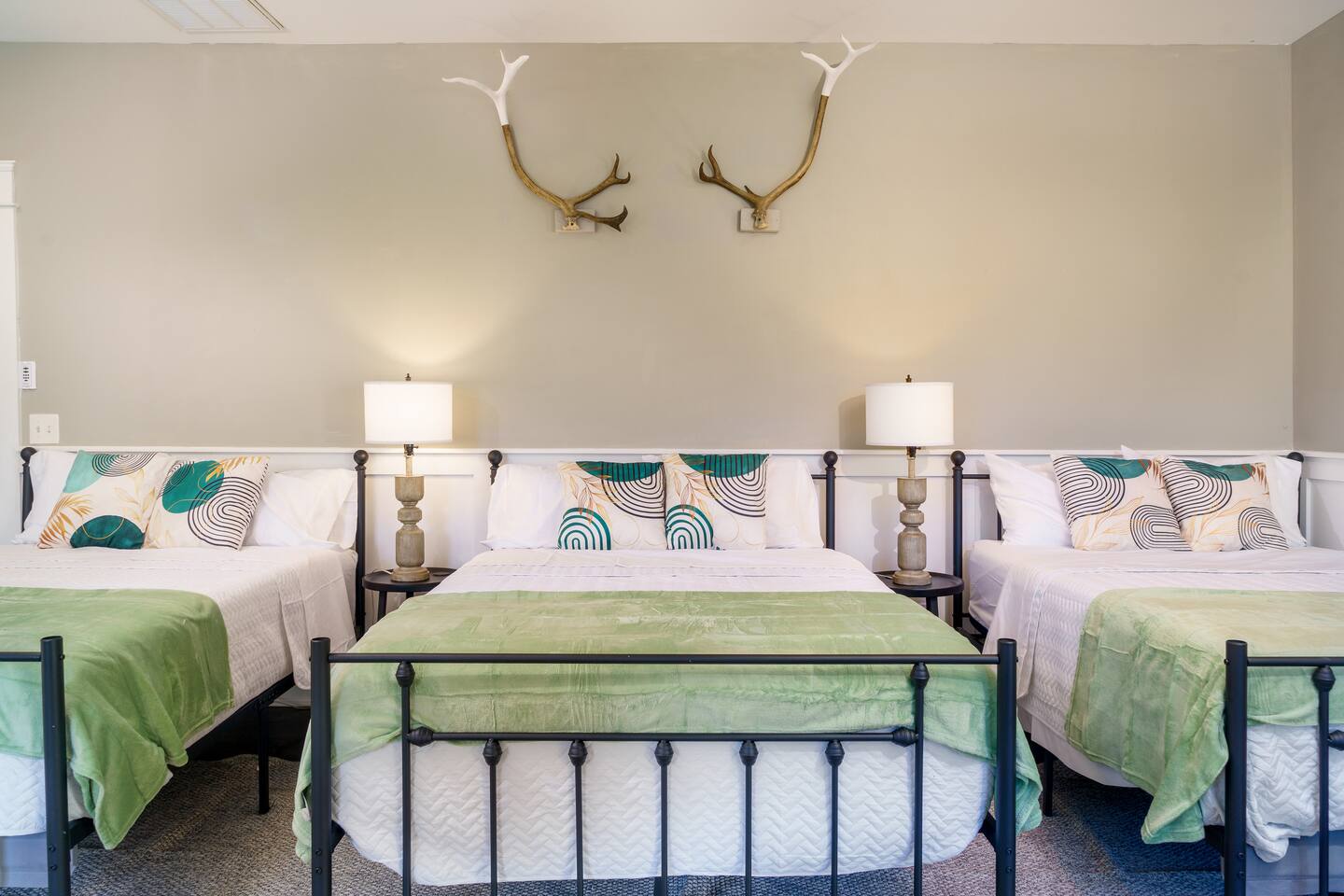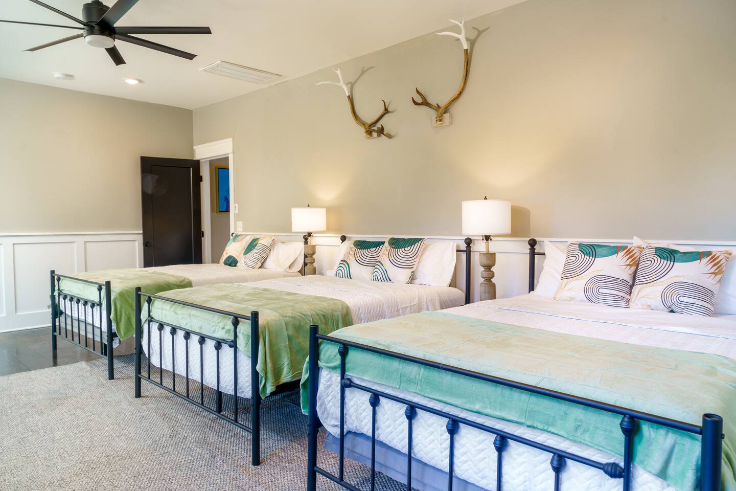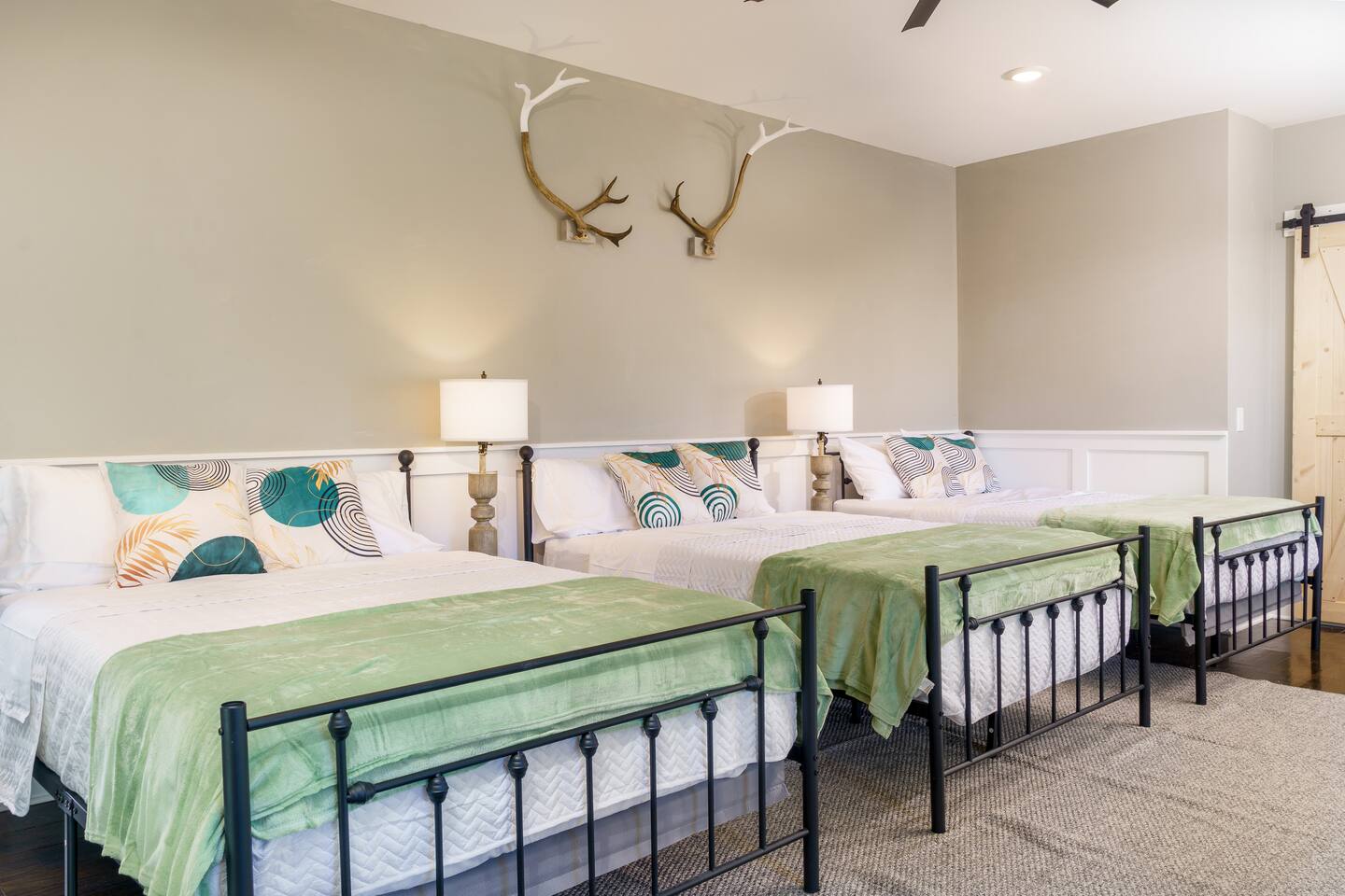 The property has 11 beds in total. Here's the breakdown: - Bedroom 1: 1 king bed - Bedroom 2: 2 queen beds - Bedroom 3 (movie room): 2 full-size beds on top and 2 pull-out loungers below them - Bedroom 4: 3 full-size beds - Bedroom 5: 1 full-size bed