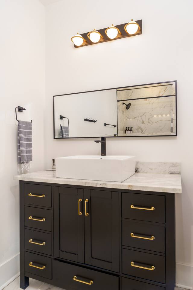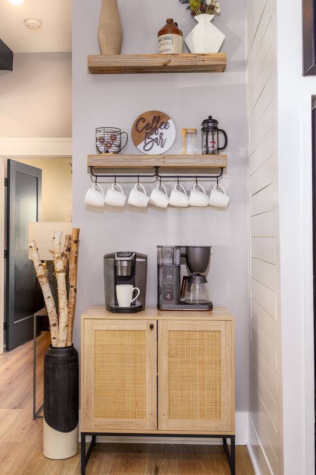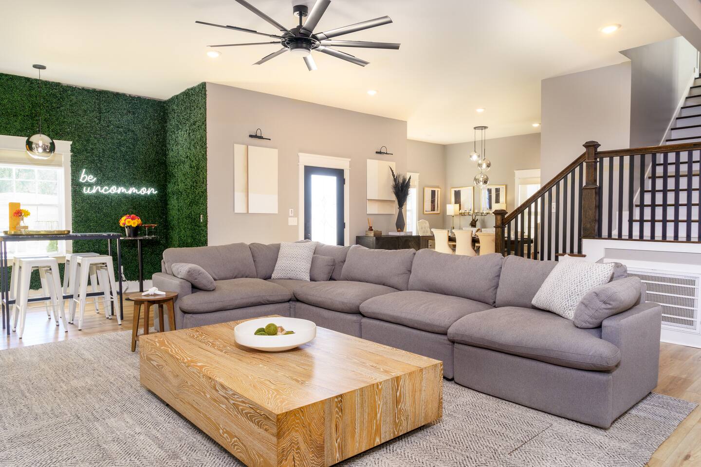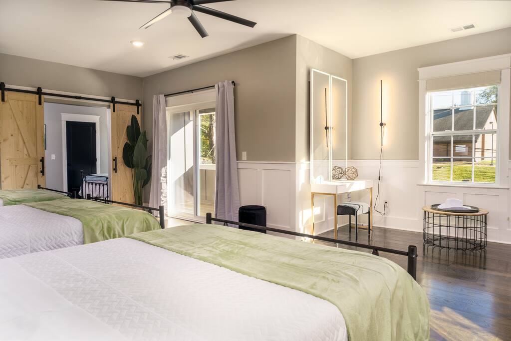 What Guests Love: Ample Space for Everyone: Featuring 12 spacious beds and various seating areas, this home ensures everyone has room to relax without feeling cramped—perfect for family vacations or group getaways. Entertainment Hub: Unwind in the dedicated movie room with a projector screen, comfy loungers, wine & beer fridge, and large Roku-equipped TVs for a luxurious entertainment experience. Photo Opportunity Heaven: Capture your Nashville memories against our gorgeous green ivy wall with the eye-catching "Be Uncommon" neon sign, complete with a glam station for getting ready. Busy Bee Glam Area: Our stylish getting ready area is equipped with light-up mirrors, vanity space, and hangers for all your outfits. Pet-Friendly: Fenced in backyard for your furry friends to safely roam and play. BBQ Grill & Chill: Enjoy outdoor cooking on the spacious backyard deck. Trendy Location: Just a quick drive to Downtown, Nissan Stadium, and Bridgestone Arena, enjoy the balanced tranquility of East Nashville with easy access to the city’s hotspots. Fully Stocked Coffee Bar: Fuel your adventures with your favorite brews. Our Keurig coffee machine and plenty of coffee supplies will ensure you’re ready to explore. House Details and Amenities Step inside this exquisitely designed home, perfectly suited for a luxurious vacation or a vibrant group trip. MAIN FLOOR Modern Kitchen: Equipped with all essential dishes, utensils, and appliances, including a fully stocked coffee bar to satisfy every caffeine craving. Living & Dining Room: Relax in the spacious living area with a sectional couch and 65” TV for streaming your favorite movies, easily accommodating gatherings with seating for 8 at the elegant dining table—complete with additional bar stools for friendly chats. Half Bathroom: Located off the dining area, featuring lively wallpaper for a fun touch. Master Suite Bedroom 1: King size bed with walk-in closets, an en-suite bathroom, and a private desk area for work or relaxation. Master Bathroom 1: Luxurious amenities like a large soaking tub, standing shower, private toilet, and double sinks for convenience. Laundry: Full-size washer and dryer for your convenience. UPSTAIRS Bedroom 2: Two queen size beds with a spacious walk-in closet. Bedroom 3: Two full size beds/loungers and a projector movie screen for your very own private theater experience! Bedroom 4: Three full size beds and a glam station with four vanities, complete with a scenic walk-out balcony. Bedroom 5: A full size bed with a sliding door for added privacy, connected to a shared bathroom. Bathroom 2: Accessible from bedrooms 2 and 3. Bathroom 3: Accessible from bedrooms 4 and 5. For your ultimate comfort, each bedroom is equipped with room darkening shades to ensure a restful night’s sleep, helping you recharge for another fun-filled day exploring all that Nashville has to offer. OUTSIDE Backyard: A fenced yard with ample space for your dogs to play, along with an outdoor grill on the deck for alfresco dining. Convenience and Comfort Enjoy the ease of Self Check-In with our state-of-the-art smart lock featuring a keypad entry system. You'll receive your personalized access code prior to arrival, allowing you to settle in and start your vacation without any hassle. The Neighborhood Explore East Nashville, known for its eclectic and artsy vibe, featuring some of the best restaurants, live music venues, and trendy hotspots. With quick access to Broadway’s excitement via a 10-minute Uber ride, you can easily enjoy downtown attractions such as Nissan Stadium, Bridgestone Arena, Grand Ole Opry, Music Row, and more. Pet-Friendly Haven Bring your pups along! Our fenced backyard is perfect for pets to roam freely. Pet Policy: Up to 2 dogs allowed ($150 non-refundable fee). Sorry, no cats. Parking Plenty of free driveway parking! Our circular driveway accommodates up to 6 cars comfortably—no street parking needed. House Rules Maximum of 12 guests. Maximum of 6 vehicles. No smoking. Must be 25+ years old to book. Quiet hours: 10:00 PM - 8:00 AM. No parties or loud music. Trash must be taken out for Tuesday morning pickup. No cats allowed. No trailers parked in the driveway or streets. FAQs Parking? Yes, up to 6 cars in the driveway. Refunds for bad weather? No refunds due to weather or natural disasters. BOOK YOUR UNCOMMON EXPERIENCE TODAY! Enjoy luxury, comfort, and unforgettable moments at The Uncommon House. Your Nashville adventure awaits!